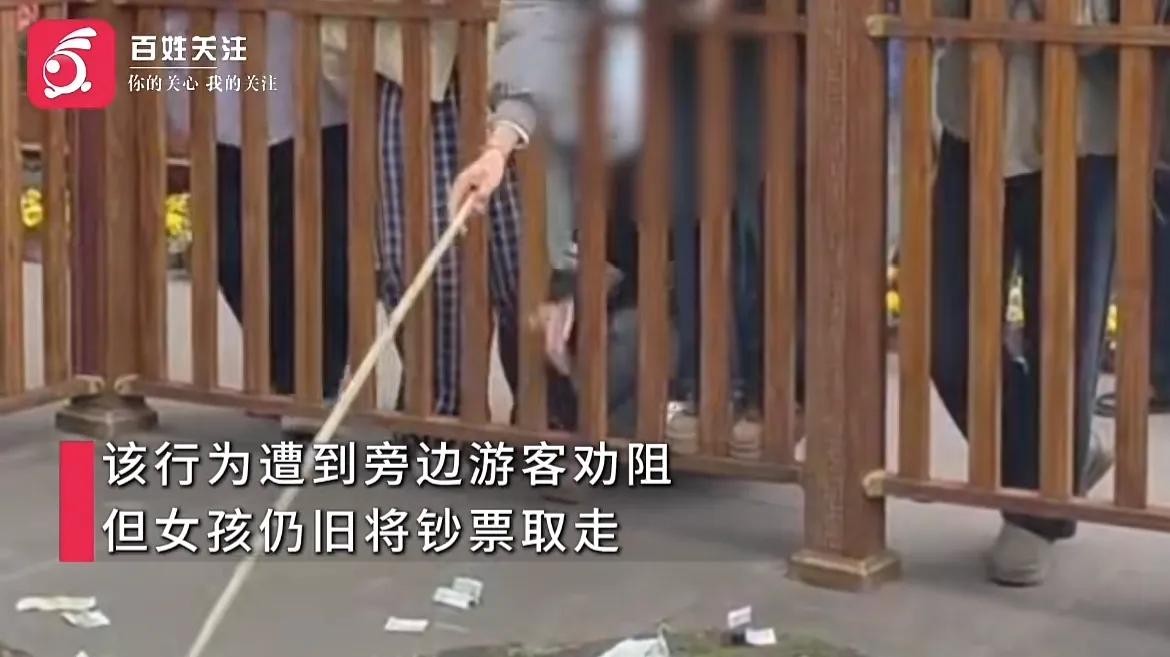 据目击者描述,这两名女子的年纪并不大,却做出了如此不堪的行为。其中一名女子大胆地站在围栏上,手里拿着长长的木棍,将身体探入祈福池中,熟练地扒拉着池水中的钱币。而另一名女子则蹲在地上,眼疾手快地将同伴扒过来的钞票一一收入兜中。她们的动作娴熟且毫不避讳,仿佛在做一件再平常不过的事情。
