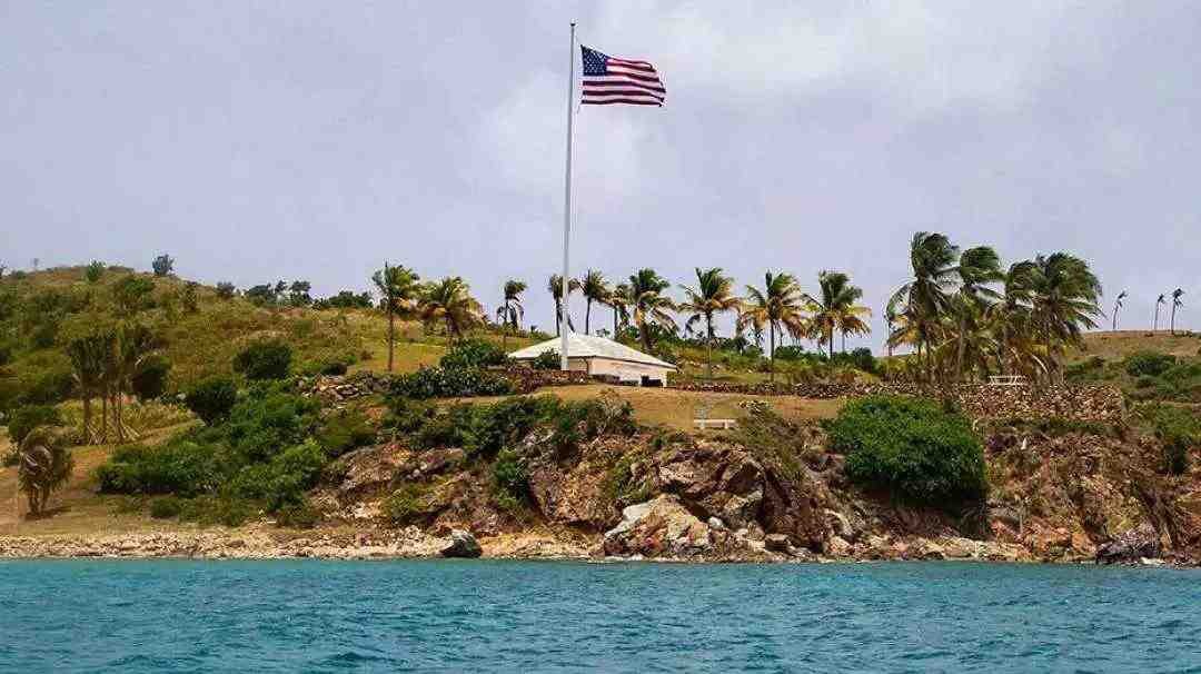 登上这座小岛就能看到,这里伫立着两面巨大的美国国旗,随风飘动。一栋公馆和一座宾馆坐落其中,蓝白相间很显眼,远处还有零星的游泳池和度假小屋。