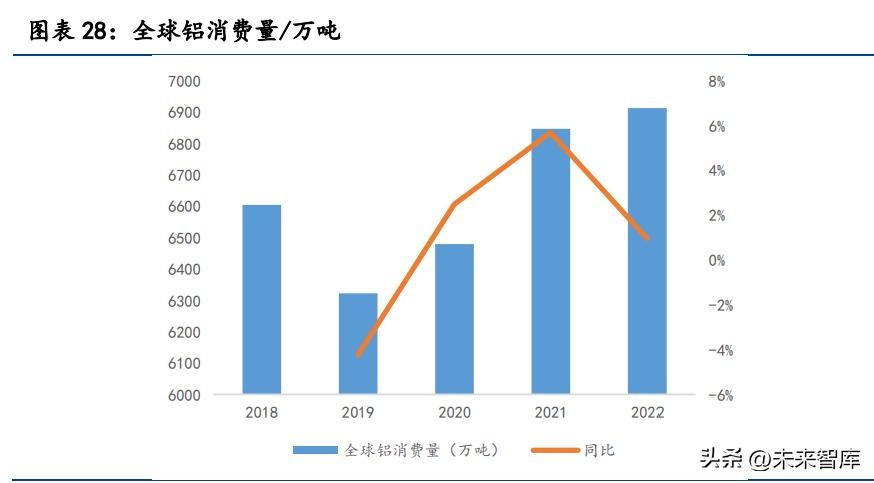 电解铝消费终端以建筑、交通运输、电子电力为主,其中建筑行业用铝以 竣工房屋的门窗、幕墙、装饰等场景为主,交通运输行业用铝以汽车、轨道交 通为主,电子电力行业用铝以电源端和输电端为主。近年来,受传统基建行业 增速放缓影响,电解铝实际消费量增速也趋于缓慢,2022 年全球铝消费增速仅 有1%。但随着绿色能源、环保减排的要求日益提高,新能源汽车、光伏等行业 增速较快,未来将贡献较多增量需求。