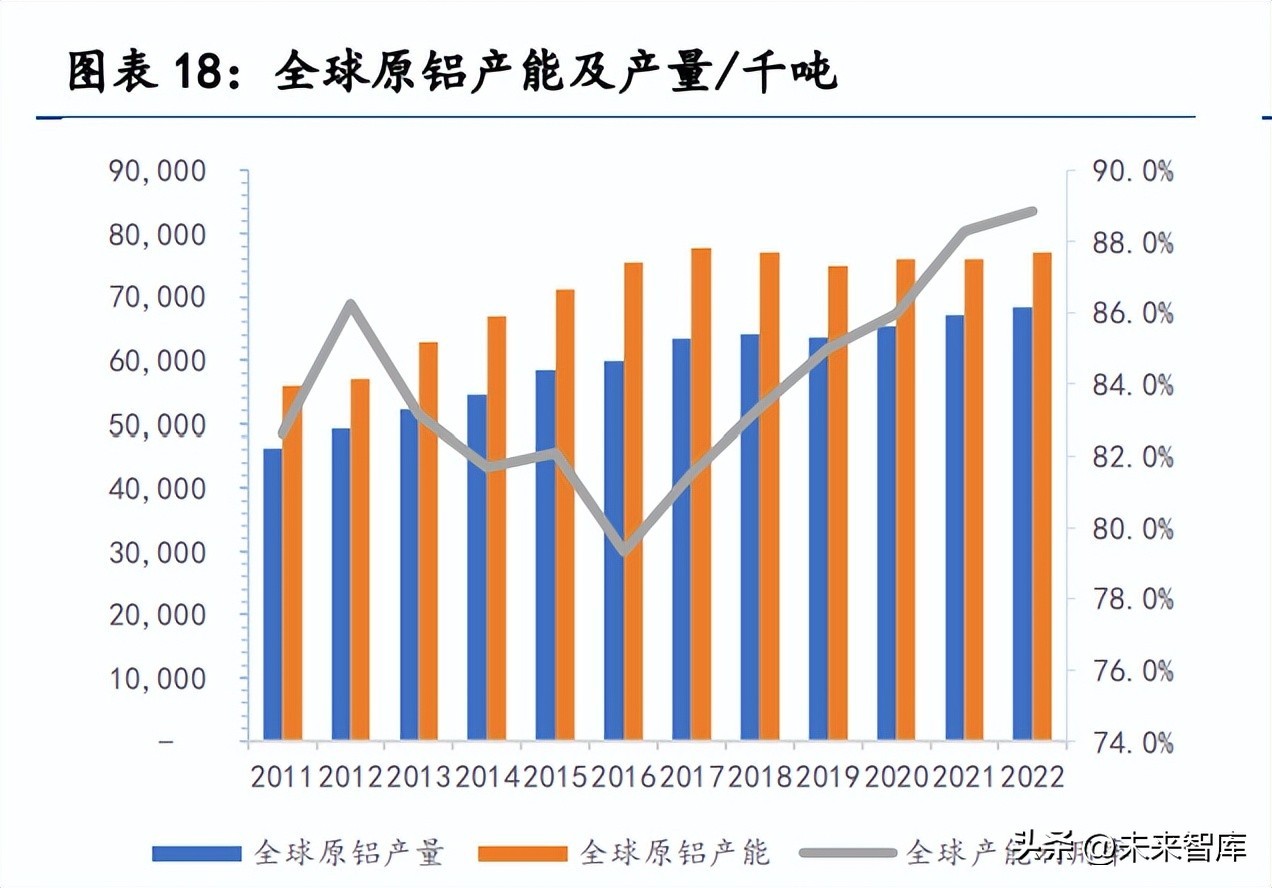 我国电解铝产能受限,产量接近饱和。2017 年开始我国对电解铝实施供给 侧改革,2018 年颁布的《关于电解铝企业通过兼并重组等方式实施产能置换有 关事项的通知》确立了我国电解铝产能天花板为 4500 万吨,以控制行业产能的 无序增长。根据阿拉丁数据, 2022 年我国电解铝产能已达 4445.1 万吨,全年 产量 4003 万吨,产能利用率达 90.06%,接近饱和状态。随着我国“双碳”行 动进入实施,取消优惠电价、取消目录电价及上浮比例限制、施行阶梯电价等 一系列能耗“双控”、限制“两高”行业的电力政策出台,预计未来新建产能有限,新投或复产产能投产不确定性加剧,产量增速将进一步放缓。