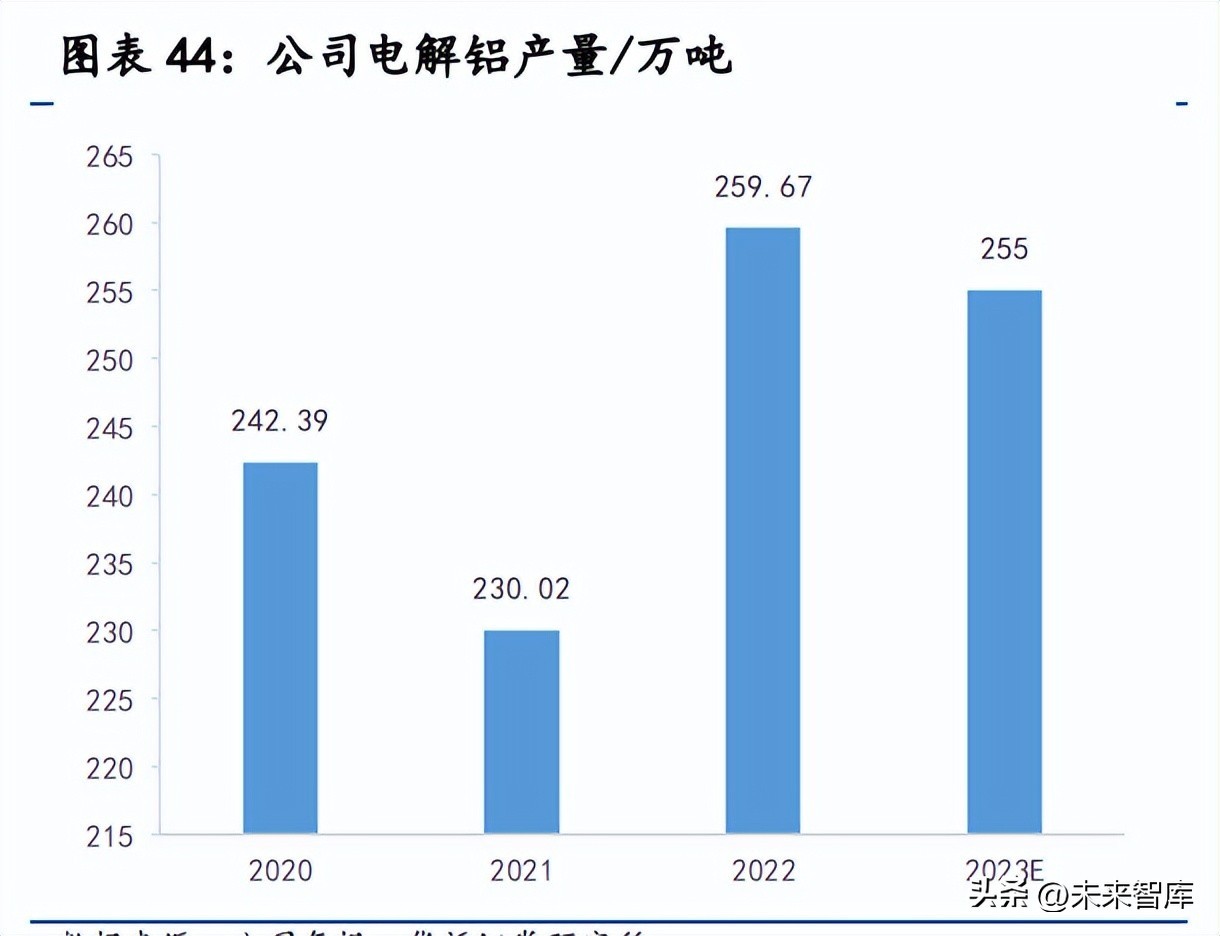 电解铝产能位居云南省第一。公司目前已建成电解铝总产能 310 万吨,其 中合规产能 305 万吨,占云南省总建成产能的 54.4%,权益产能 254 万吨。由 于云南水电占比超过 80%,枯水期限电常态化,产量难以达到满产状态。2021 年受能耗管控和枯水期缺电双重影响,公司电解铝产量 230.02 万吨,同比下降 4.41%;2022 年 9 月以来,云南省因电力供需形势严峻,实施了能效管理,面 对限电的不利影响,公司通过安排设备检修维护、合理组织生产、优化产品结 构等方式积极应对,保持生产稳健运行,全年电解铝产量 259.67 万吨,同比增 加 12.89%,达近三年来最高水平。