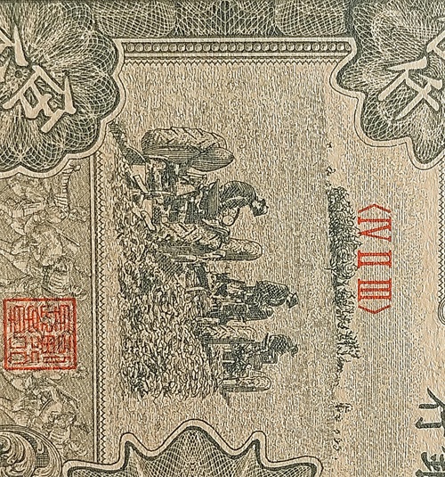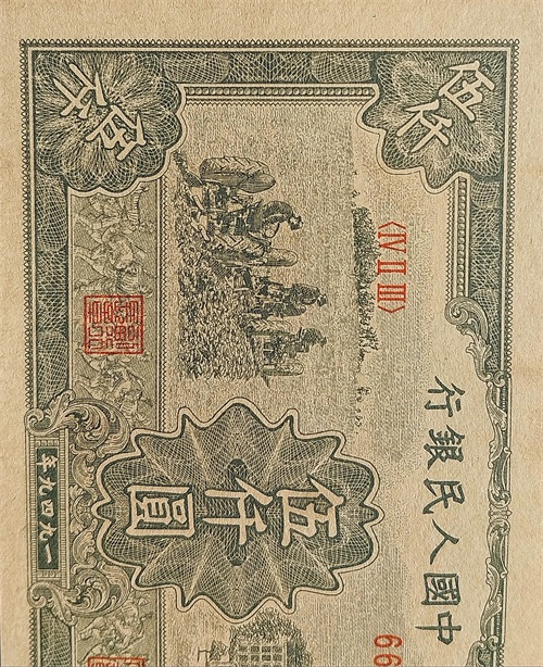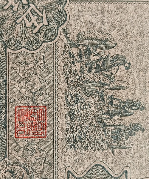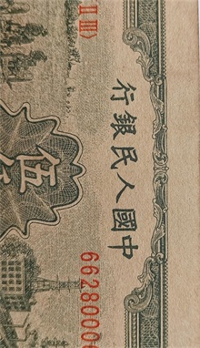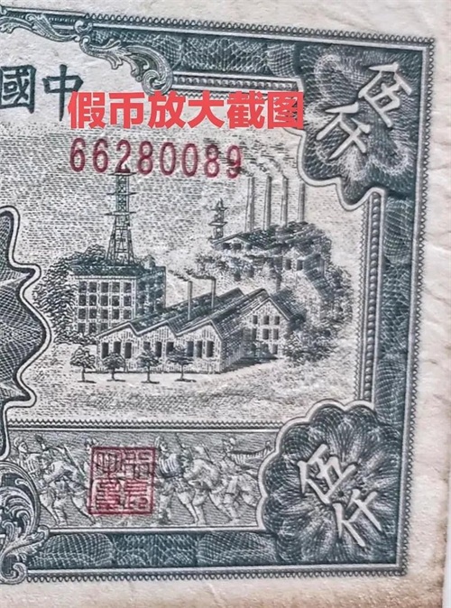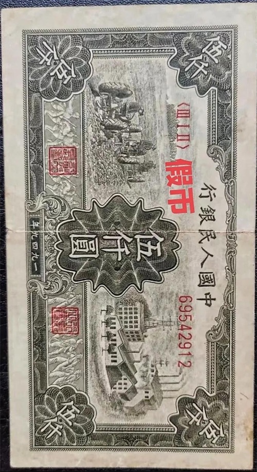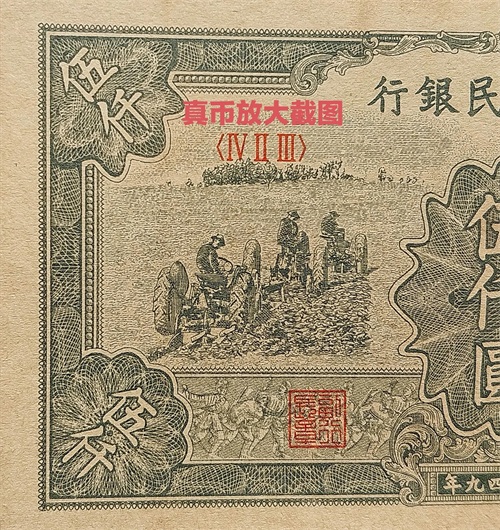 第一版人民币面值伍仟圆——耕地与工厂真实的原始纸币是雕刻版印制其中一枚 分享给大家观赏。