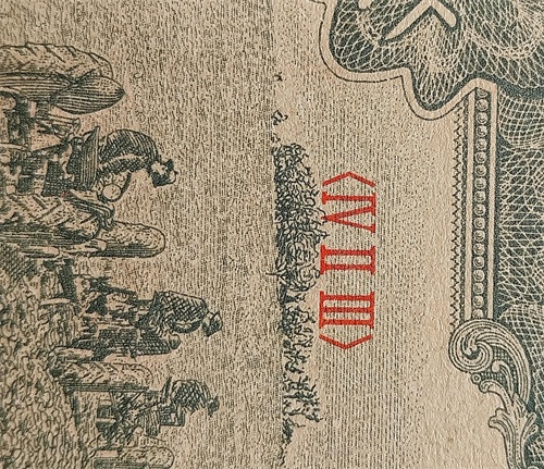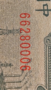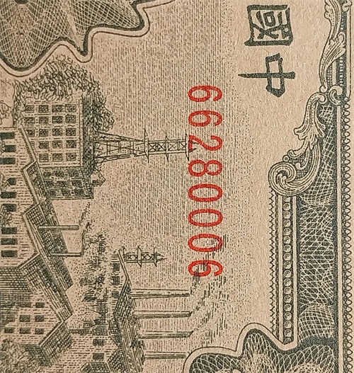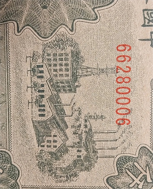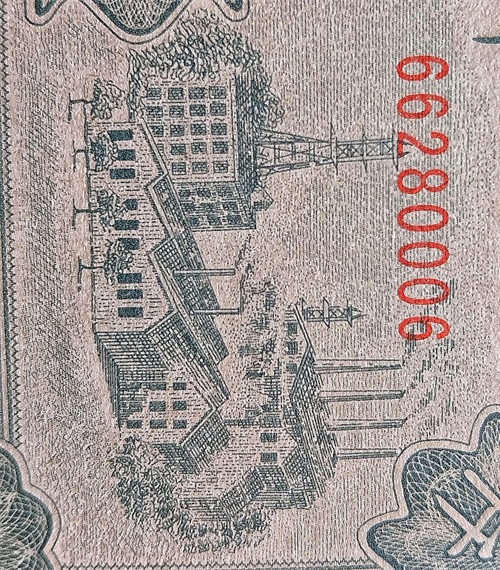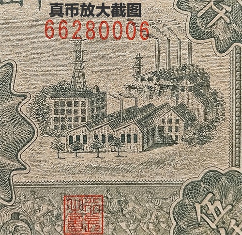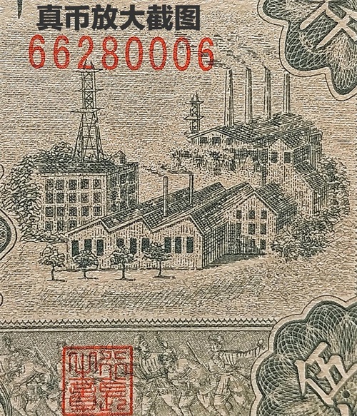真币《耕地与工厂》的冠号和数号码清晰流畅,颜色温润柔和纯正,有立体感。