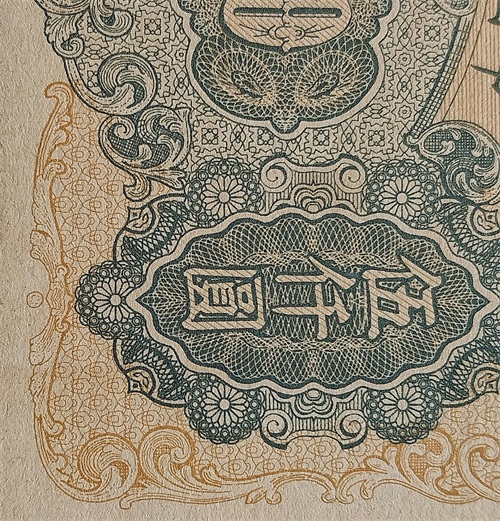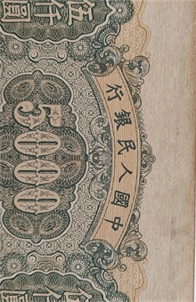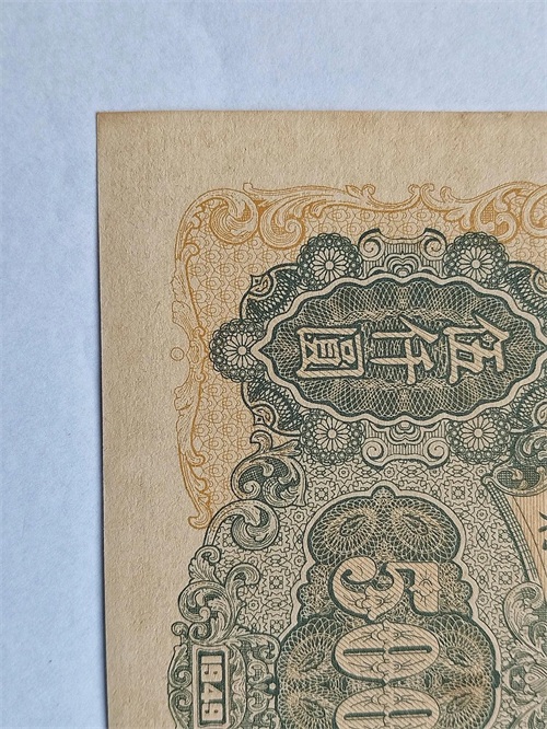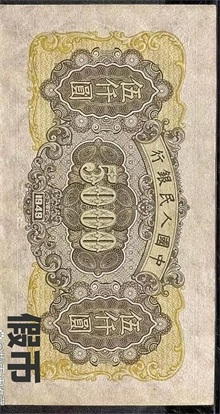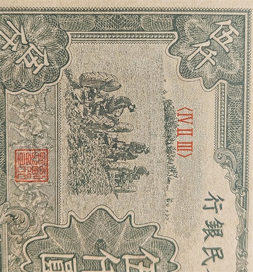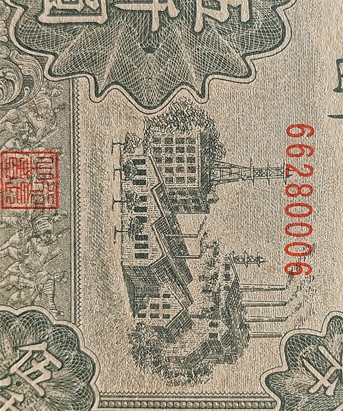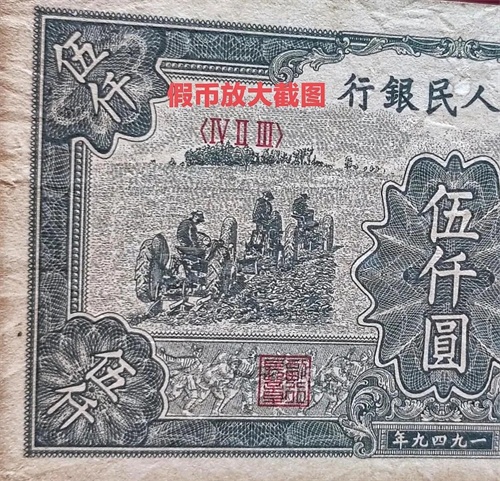 真币面值伍仟圆《耕地与工厂》没有底纹。有雕刻版印刷迹象。如下图