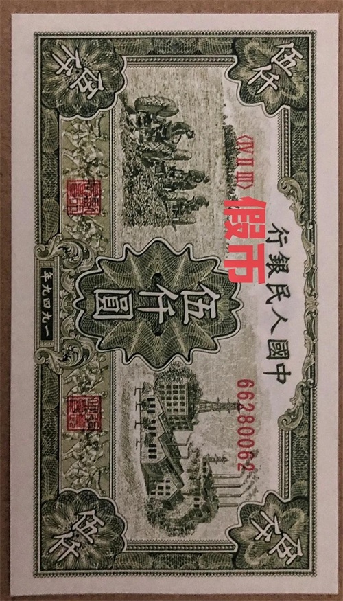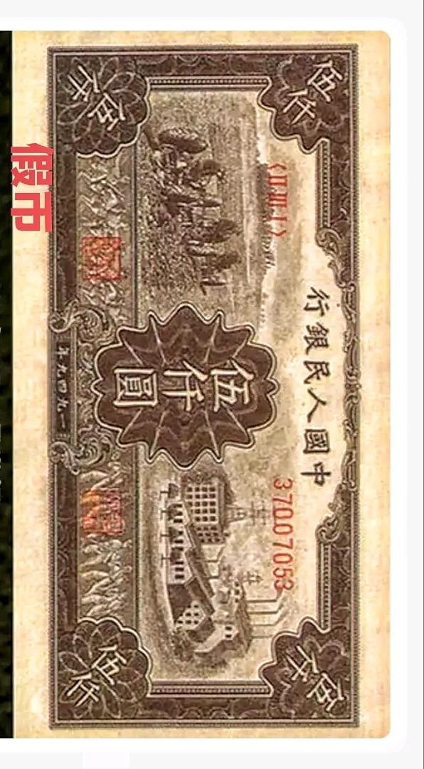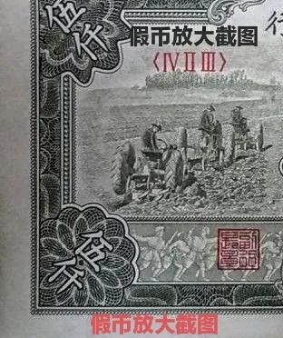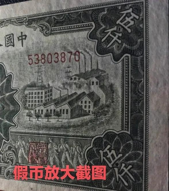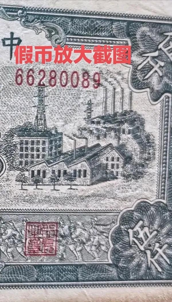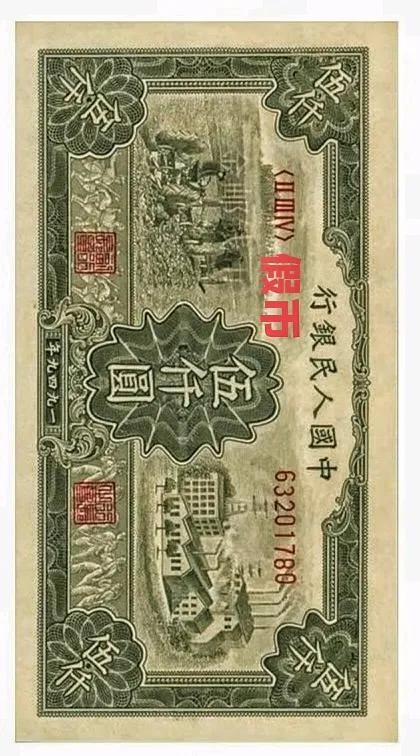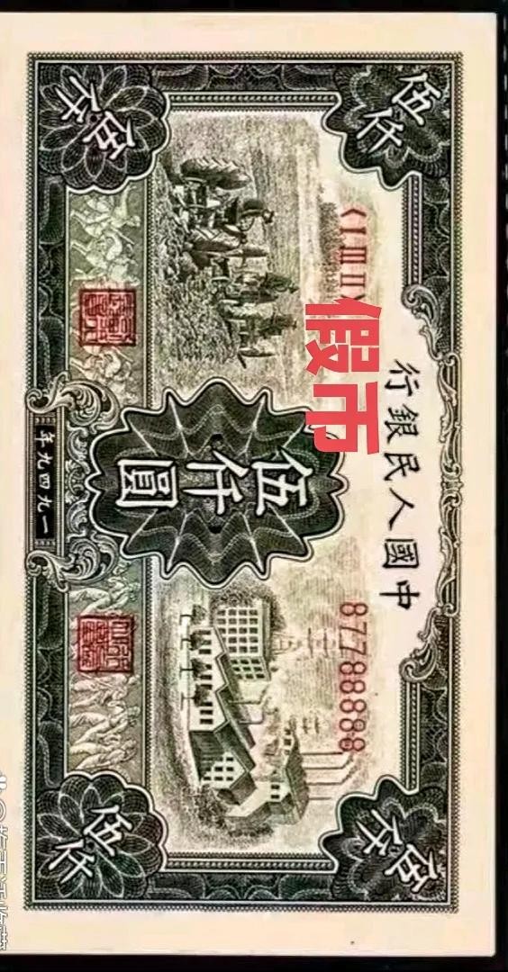 如下面几副图是第一版人民币清晰假币面值伍仟圆——耕地与工厂。第一版人民币只要是胶印印刷百分之百是假币 截图: