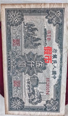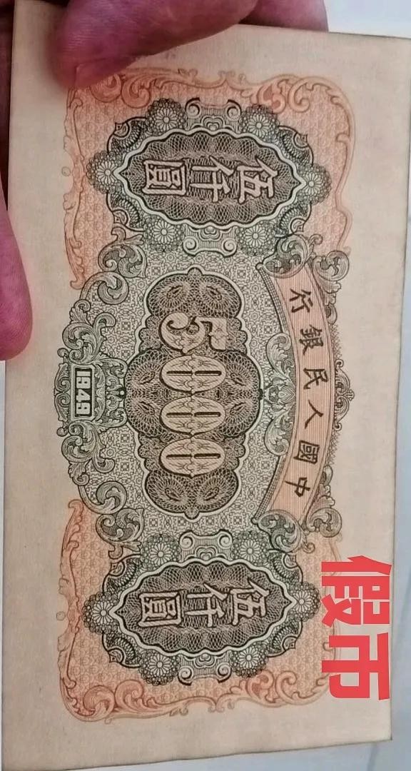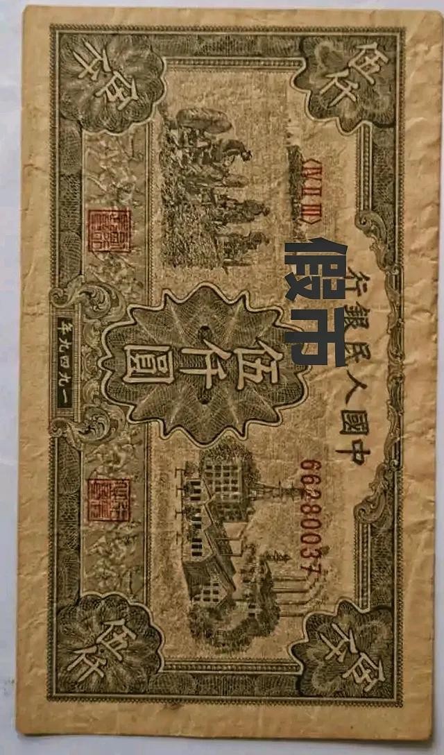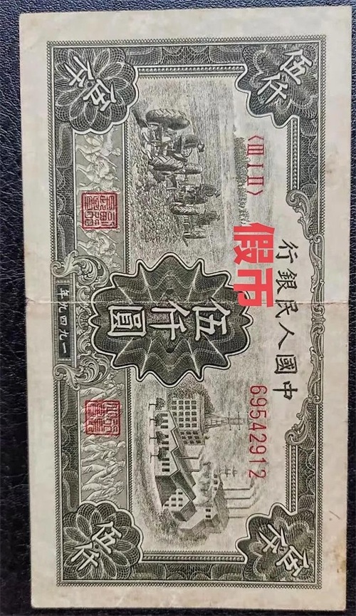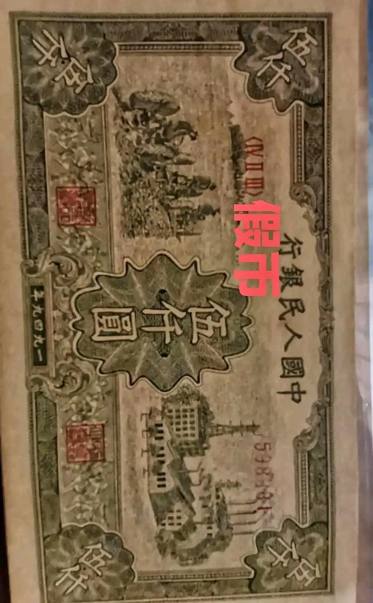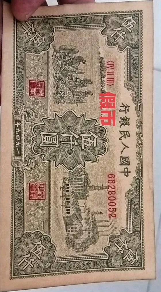 如下面几副图是第一版人民币清晰假币面值伍仟圆——耕地与工厂。第一版人民币只要是胶印印刷百分之百是假币 截图: