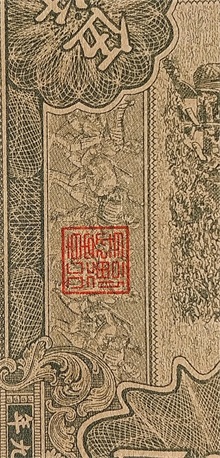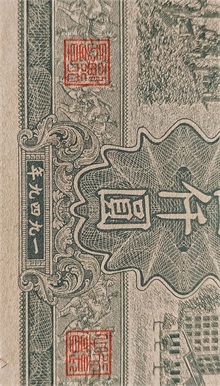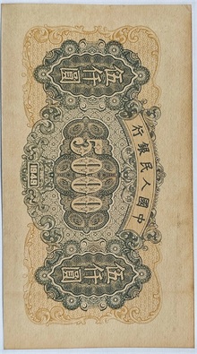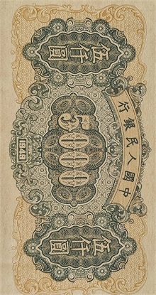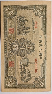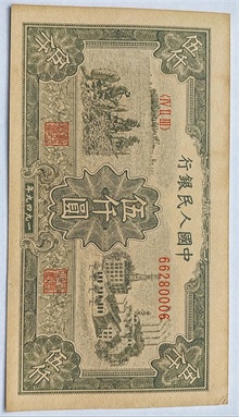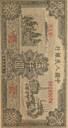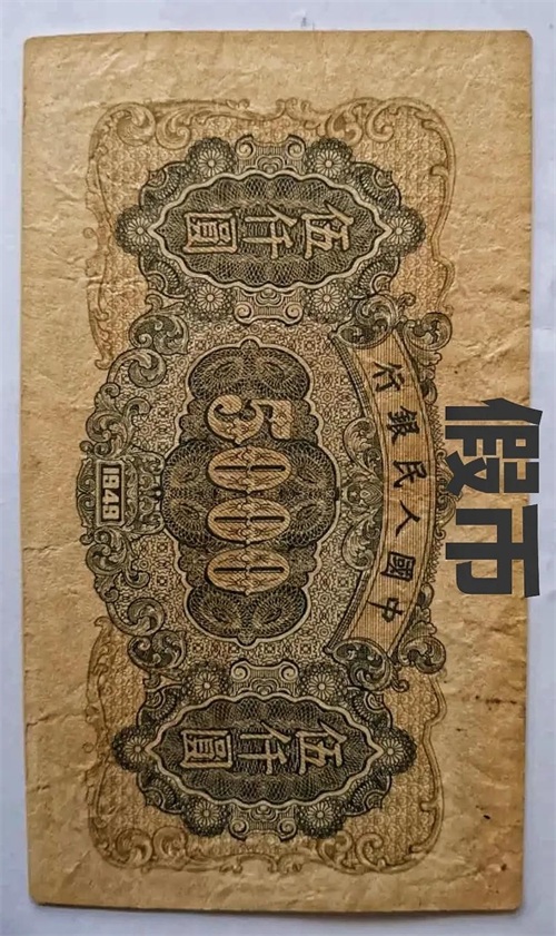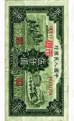 1949年发行了面值伍仟圆——耕地与工厂流通纸币流通使用到1955年5月10日。