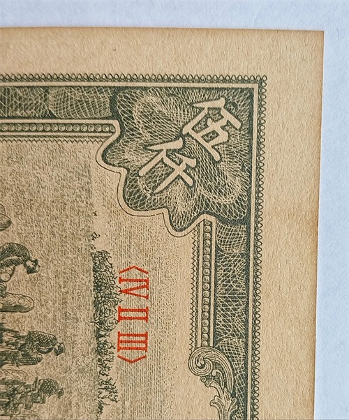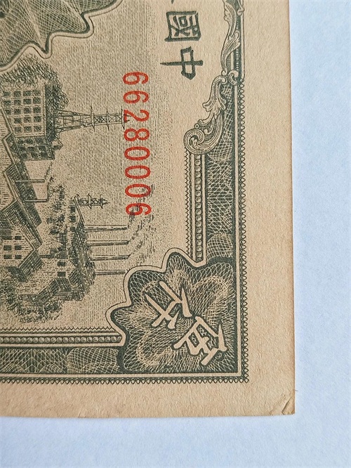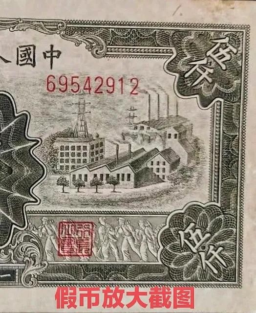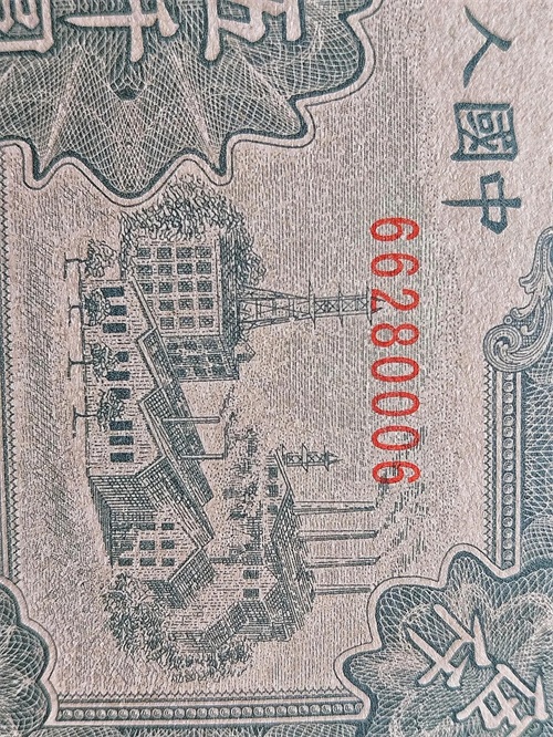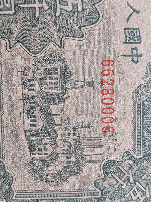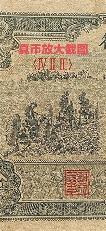 4、第一版人真币《耕地与工厂》,细致观察,通过视觉票卷内没有底纹有雕刻版印制的痕迹,。纸币图案 点 线段 线条刷色各个角落印制清晰干净利落,不模糊。有立体感,真实视觉效果。