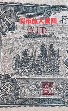 现代造的假币(电脑绘制高清打印)俗称高仿币。假币颜色鲜艳,色泽混合杂乱,放大观看,点 线段 线条 底纹 鱼目混珠;以假乱真,截图放大,再次加倍放大颜色随着发生杂色,字体,印章,底纹线条,线段模糊不清晰,浑浊,视觉还伴有反光而刺眼,眼观极度华而不实,浮华,不真实!假币生搬硬套,印章,画面,字体呆板,没有立体感,放大倍数没有神韵。