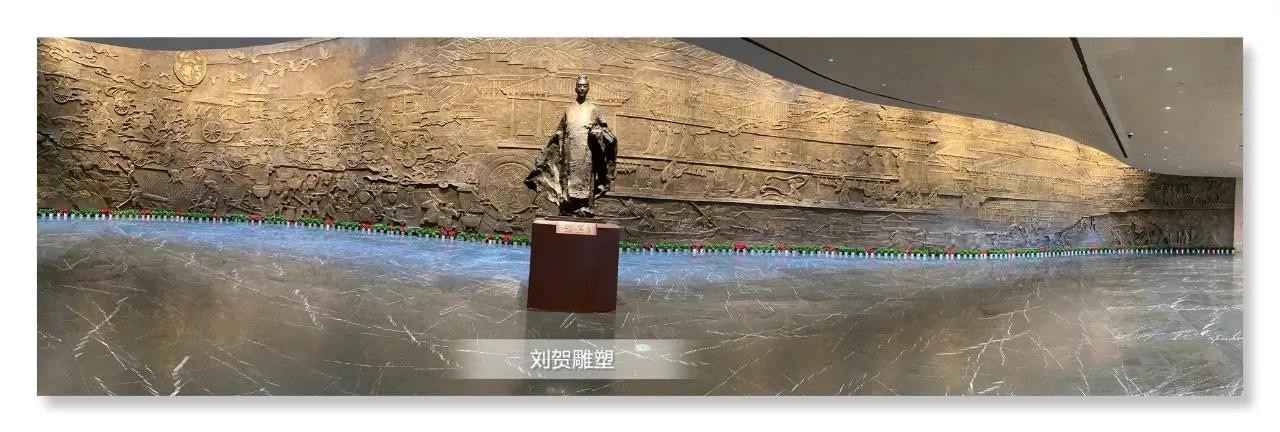 进入博物馆,一起来看一下第一层的一大展厅:金色海昏,一进门就是大大的刘贺像,以及很长的一段铜雕壁画~来个全景图欣赏下,从雕塑看刘贺还有点帅啊(祖母可是倾国美女李夫人)~