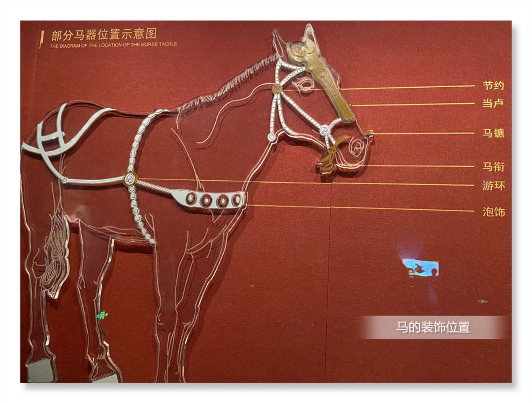 二楼展厅展示了一个比较有特色的文物:当卢,简单来说就是马的装饰品,先来看一个图示,认识下当卢的位置,土豪的马都穿得很是豪华啊~