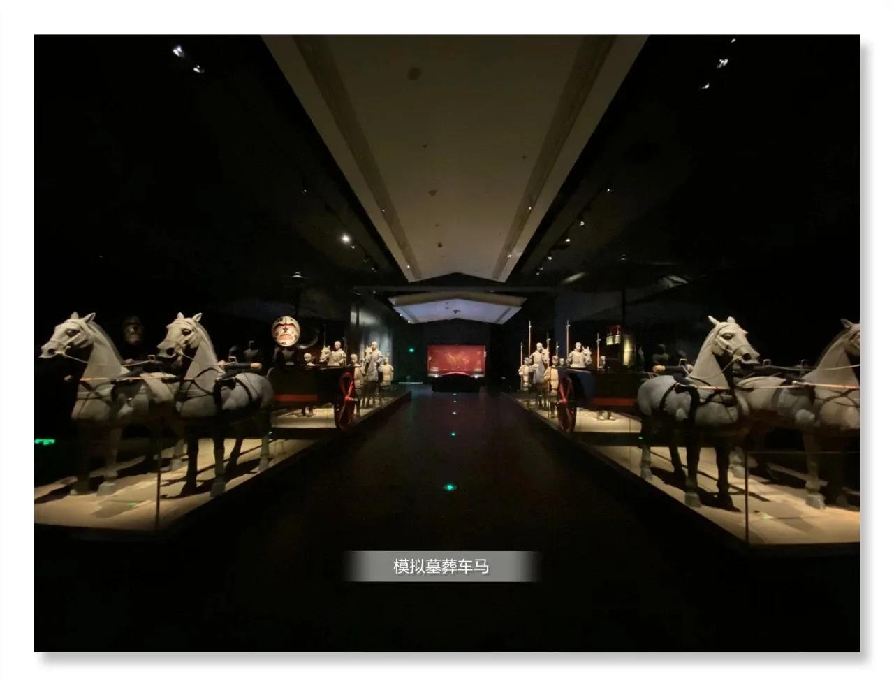 二楼的金色海昏一进来就是车马陈列室,海昏侯墓有车马坑,车马坑出土了实用高等级马车5辆,马匹20匹,错金银装饰的精美铜车马器3000余件。这也是中国长江以南地区发现的唯一一座带有真车马陪葬坑的墓葬,所以在二楼金色海昏的展厅,有车马的模拟展示~
