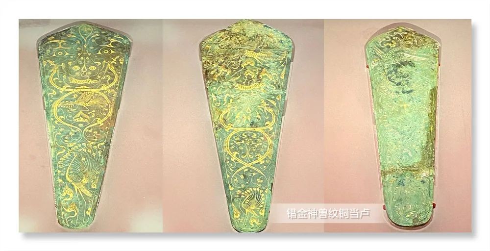 海昏侯博物馆的一大看点:错金神兽纹铜当卢~主要纹饰有白虎,凤鸟,太阳,月亮,云气,龟鱼,羽人,纹饰复杂,画面内涵丰富,反映了汉代人的宇宙观以及渴望长生不死老,死后升仙的愿景。