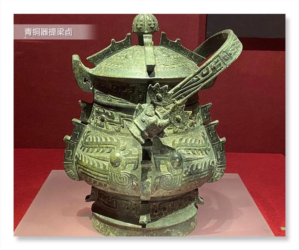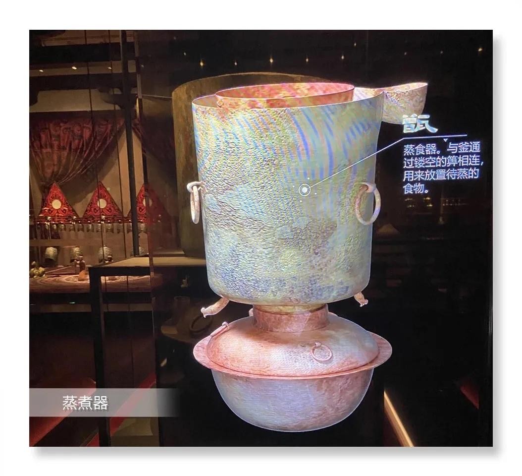 墓地中最大的一件青铜器:蒸煮器,博物馆特意用屏幕视频展示了蒸煮器的工作原理,非常直观~