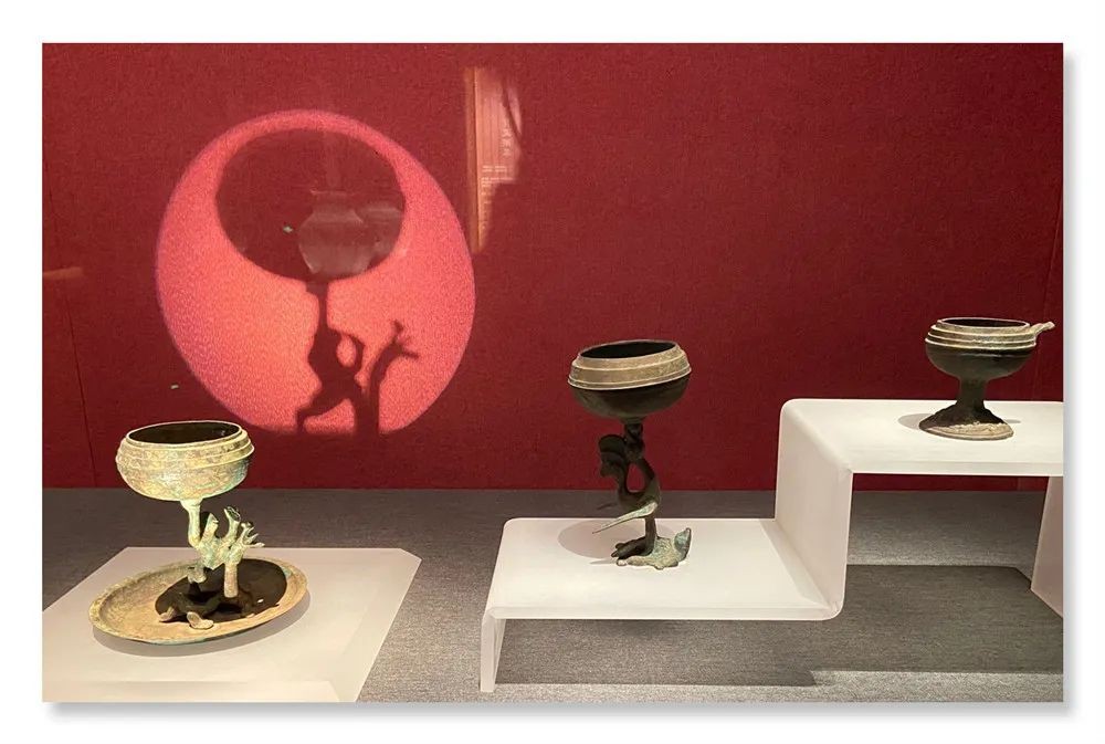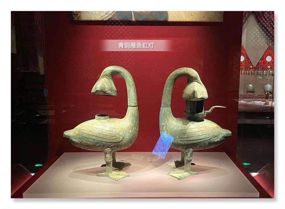再来看看青铜雁鱼釭灯,多见于汉墓,在大雁咬鱼的位置点灯,然后烟会吸到大雁肚子里,做到无烟的效果~