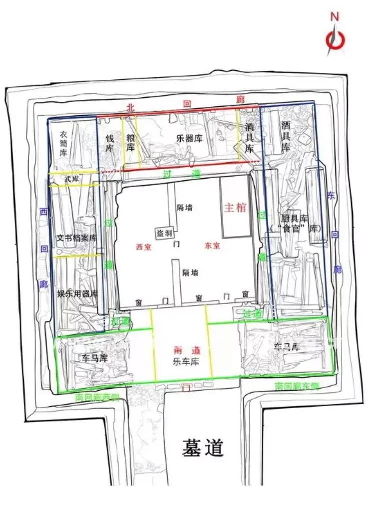 主墓室中间很明显有一个14米的盗洞,打的位置很正,巧的是主棺不在中间,没有被洗劫一空~