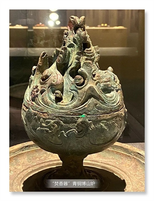 “博山”为传说中仙山,修仙理想胜地,炉体呈青铜器中的豆形,上有盖,盖高而尖,镂空,呈山形,山形重叠,其间雕有云气纹、人物及鸟兽,这个博山炉在中山靖王墓也有同款,感觉中山靖王墓的更加精美~