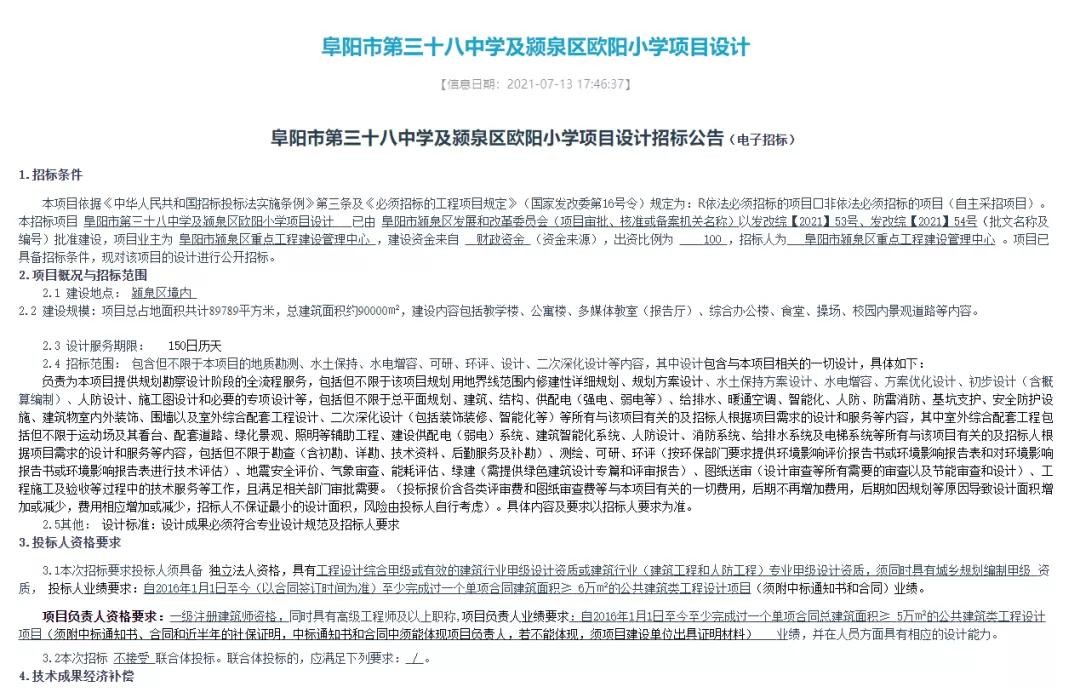 此外,阜阳市第三十八中及颍泉区欧阳小学项目设计招标文件也均已发布。