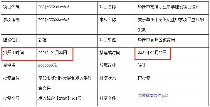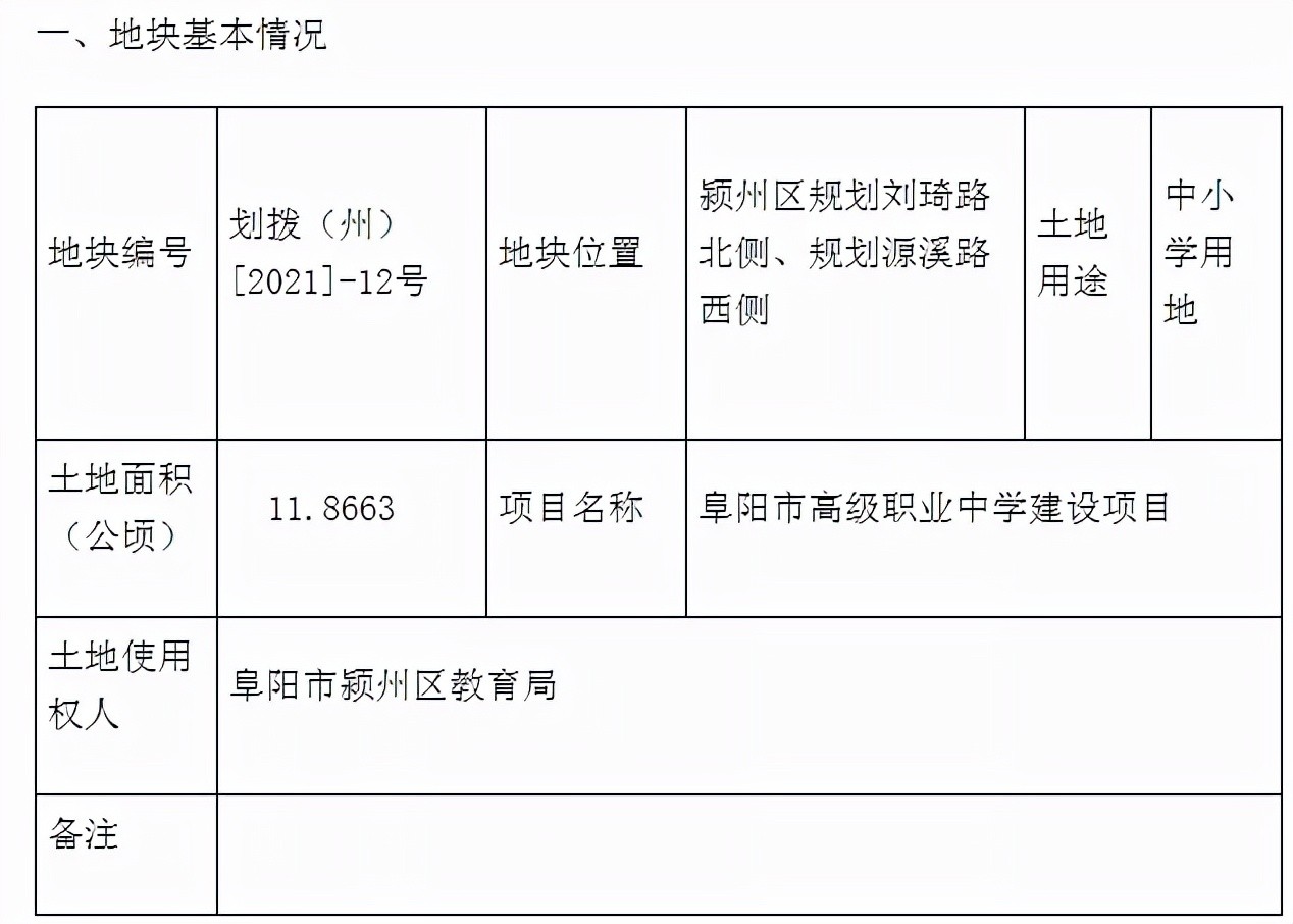 昨日,《阜阳市高级职业中学建设项目用地划拨前公示》