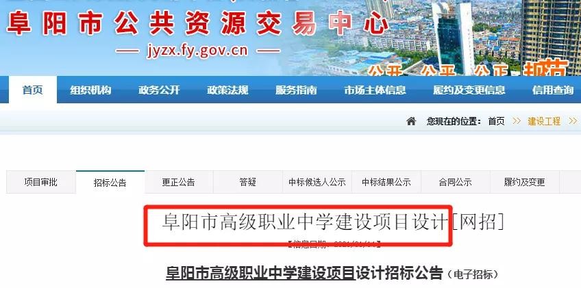 但编者发现,早在今年1月份,阜阳公共资源交易中心就发布过阜阳市高级职业中学建设项目设计招标公告。