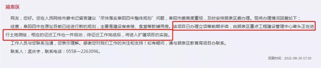 据颍泉区教育局回应,阜阳四中在原址目前已经进行新的规划,主要是建设宿舍楼、食堂等教辅用房。该项目已办理立项等前期手续,由颍泉区重点工程建设管理中心牵头正在进行土地测绘,相应的征迁工作也一并启动,待征迁工作完成后,将进入扩建项目的实施。