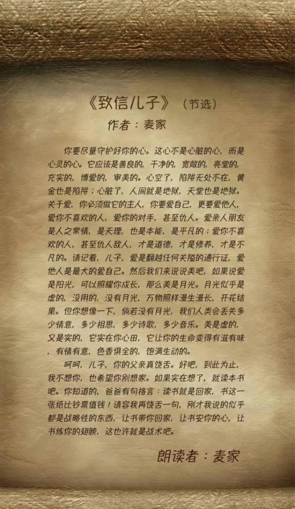 2017年3月,麦家登上央视《朗读者》栏目。征得儿子同意后,麦家当着全国观众的面,朗读了自己写给儿子的信:我在扮演父亲的时候,没有太称职。每个孩子与父母冷战的时候,都会深深刺伤父母的心。