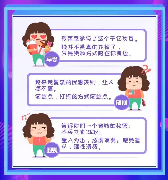 “全民购物节”激情上演的同时也引发了全民“调侃”。“剁手党”们纷纷自豪地表示自己参与了这次千亿项目。同时眼花缭乱的优惠规则也令消费者郁闷不已。此外,“吃瓜群众”呼吁大家要谨慎“剁手”,别被促销蒙蔽了双眼,“最省钱方案:不买立省100%!”