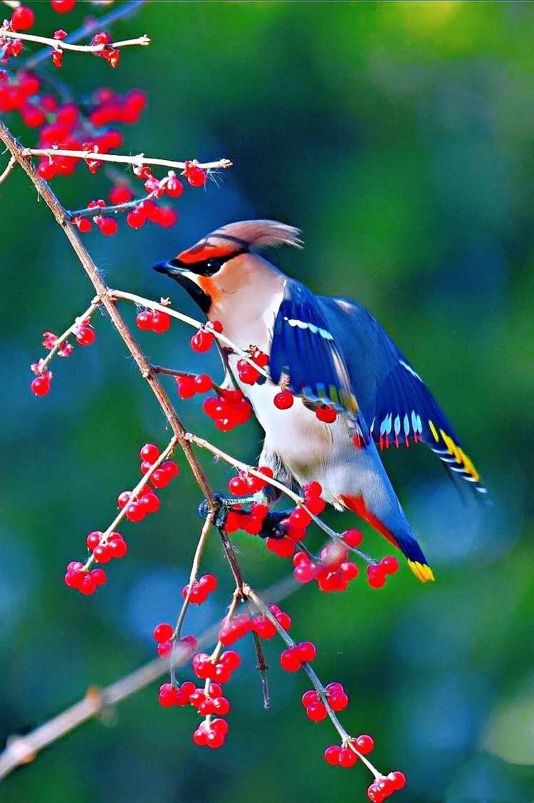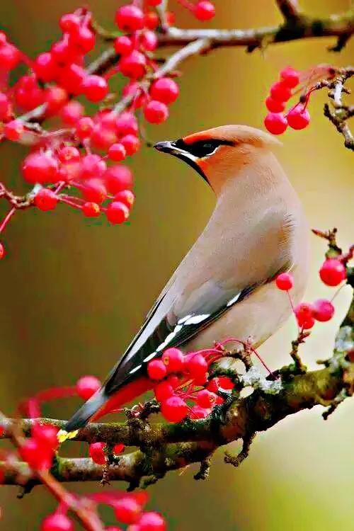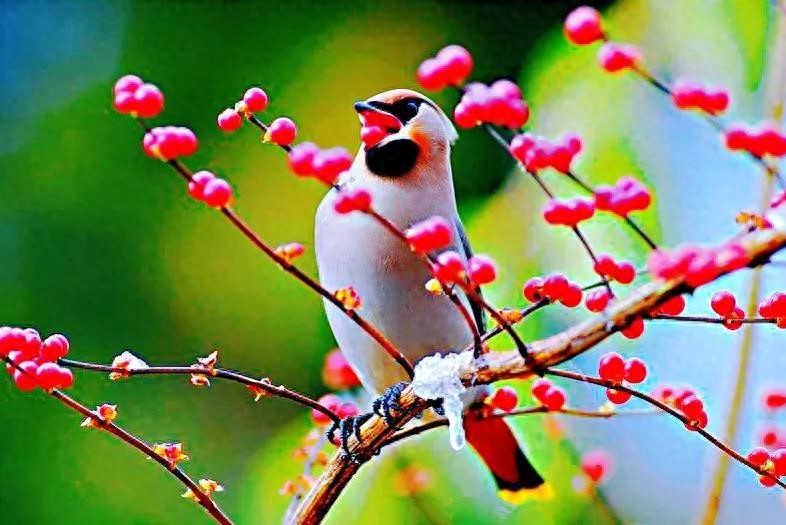 太平鸟食性:繁殖期以昆虫为食。秋后则以浆果为主,如:松果、蔷薇果、卫茅果、鼠李果、山楂果、花楸果等。