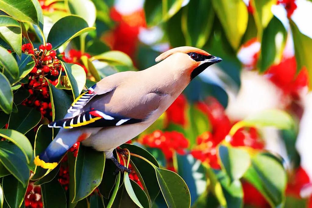 太平鸟体态优美,鸣声清柔,为冬季园林内观赏鸟类。