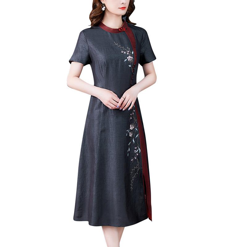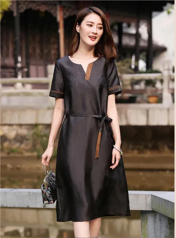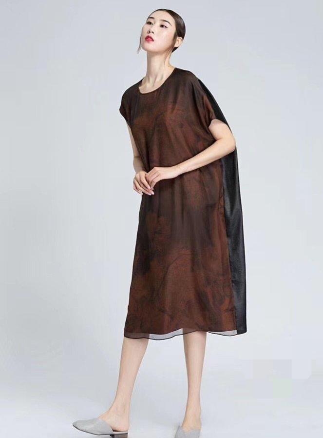 香云纱连衣裙,大多是极简设计,有点禅意宽松款式,很少见到紧身款式,原因是因为真丝这种面料,由于是蚕丝制作,生来就比较金贵,如果过紧拉伸,会造成扒缝,所以香云纱的宽松款式,很适合炎热的夏天穿搭