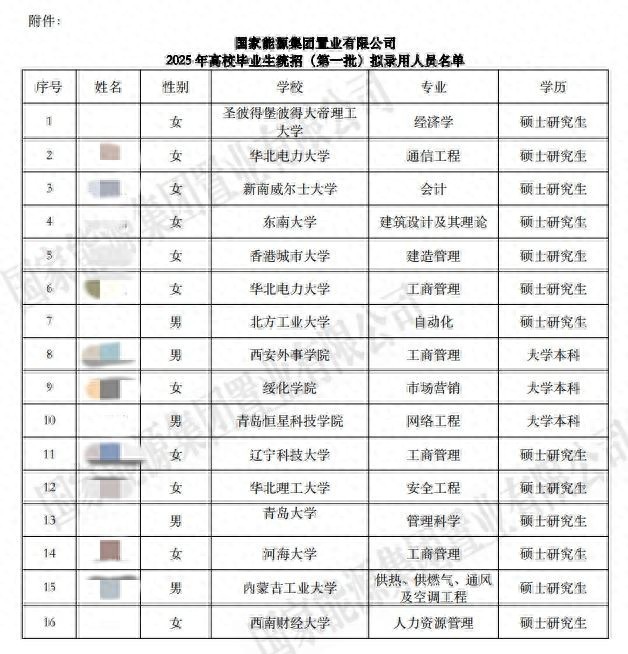 近日,国家能源集团置业有限公司(简称国能置业)一份高校毕业生统招拟录用名单引发关注。这份招录16名毕业生的名单中,有13名硕士研究生和3名本科生,其中13名硕士研究生分别来自华北电力大学、西南财经大学、圣彼得堡彼得大帝理工大学等国内外知名院校,而3名本科生毕业院校较普通,分别来自绥化学院、西安外事学院、青岛恒星科技学院。