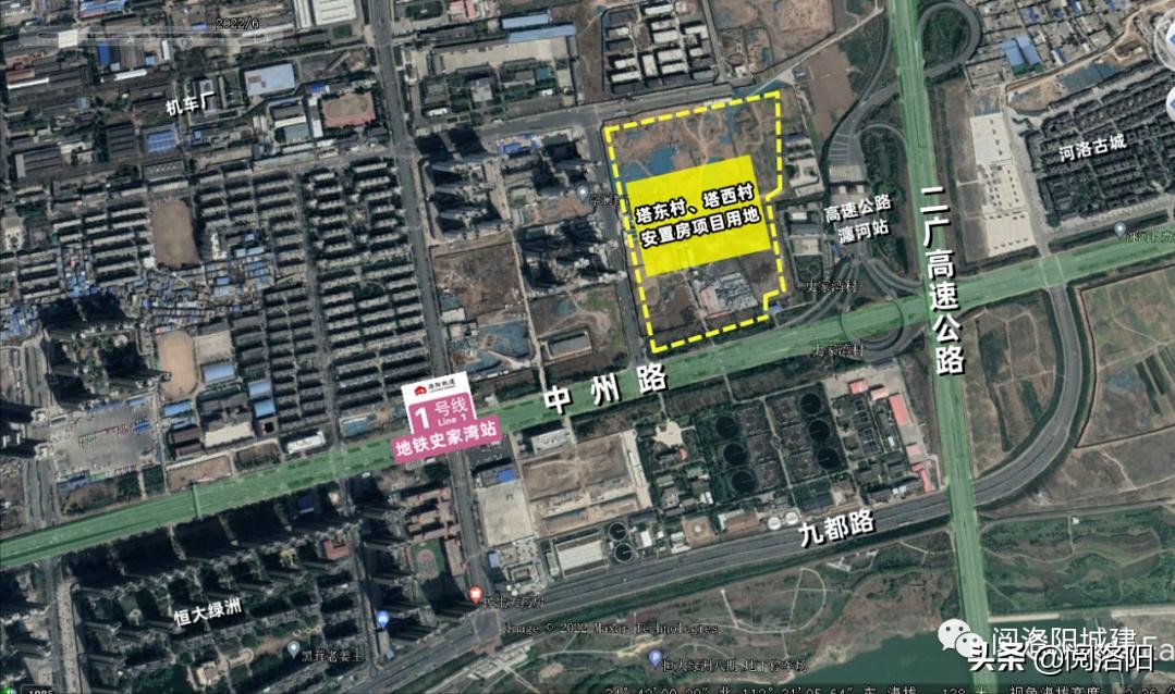其实推测起来也不难,首先上图就是塔东村、塔西村的安置房地块,大概位置在中州路与二广高速公路交汇处附近,离地铁1号线史家湾站很近。