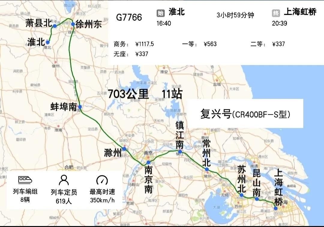 G7766次列车由淮北站开往上海虹桥站,下午16点40分淮北站始发,晚上20点39分到达终点站上海虹桥站,用时3小时59分,经淮萧联络线、郑徐高铁、京沪高铁运行,中途停靠萧县北站、徐州东站、蚌埠南站、滁州站、南京南站、镇江南站、常州北站、苏州北站、昆山南站。