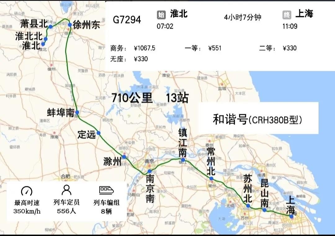 G7294次列车由淮北站开往上海站,是淮北到上海用时最长一趟高铁,早上7点02分淮北站始发,中午11点09分到达终点站上海站,用时4小时7分钟,经淮萧联络线、郑徐高铁、京沪高铁、沪宁城际运行,中途停靠淮北北站、萧县北站、徐州东站、蚌埠南站、定远站、滁州站、南京南站、镇江南站、常州北站、苏州北站、昆山南站。