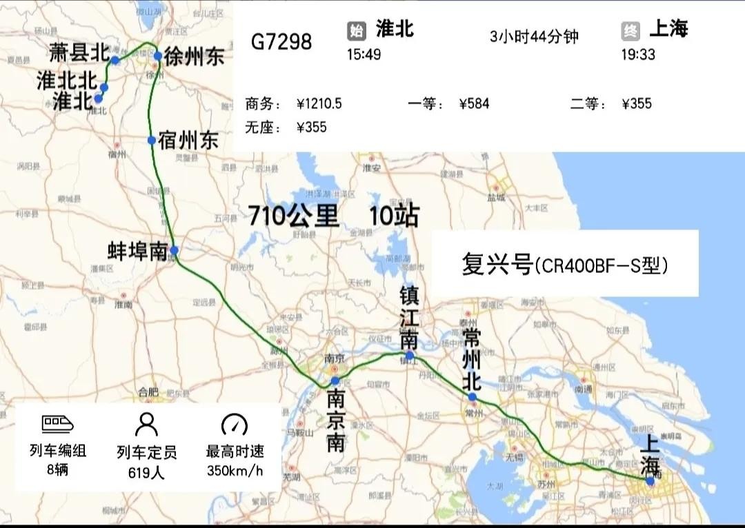 G7298次由淮北站开往上海站,下午15点49分淮北站始发,晚上19点33分到达终点站上海站,用时3小时44分钟,经淮萧联络线、郑徐高铁、京沪高铁、沪宁城际运行,中途停靠淮北北站、萧县北站、徐州东站、宿州东站、蚌埠南站、南京南站、镇江南站、常州北站。