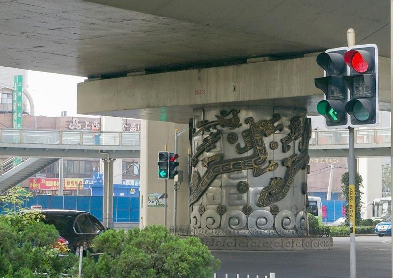 上海的延安、南北、内环三个高架,组成的是上海的“申”字,这个九龙柱就是位于申字正中间那一个点上,就是延安和南北两个高架交会的地方,这是巧合吗?为什么全国千千万万根柱子,就只有这根柱子与众不同?为什么上海高架路有不下成百上千个支柱,无一例外都显露着水泥混凝土的本色,唯有南北和东西高架路相接处下一柱妆以龙纹,并且银底金纹的龙纹?