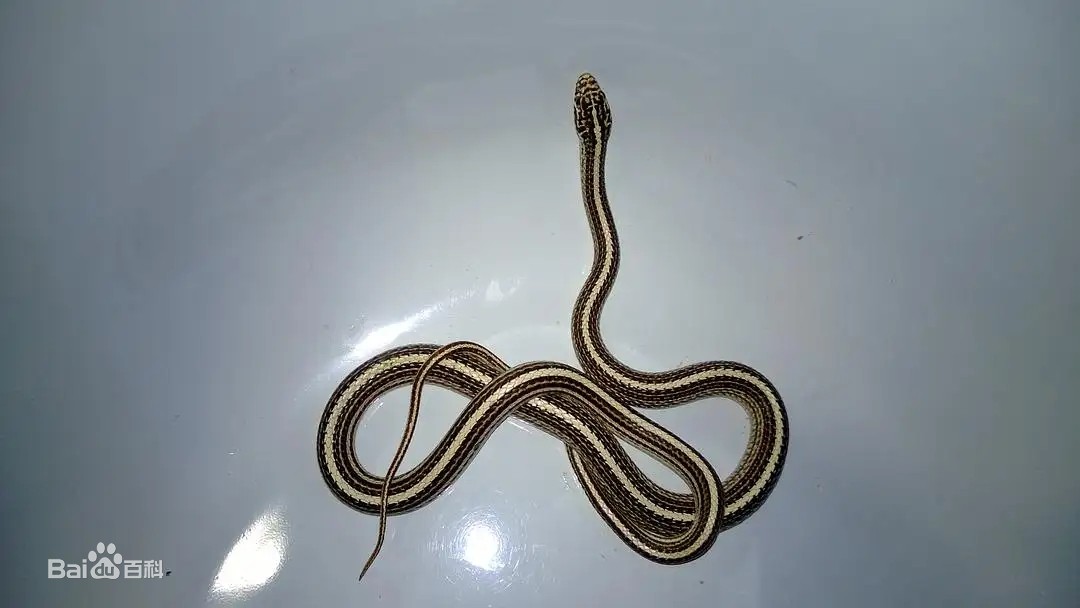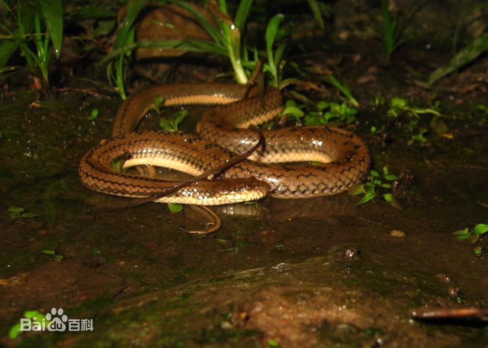 广泛分布于我国南半部的一种游蛇。全长700毫米左右。头背暗棕色,枕部两侧各有一黄色的椭圆形枕斑;躯干及尾背面黑褐色,背侧部有二行浅黄色纵线,系由许多铁锈色点斑缀成;腹面淡黄色,腹鳞及尾下鳞外侧有二条窄长黑点缀成的纵链纹。