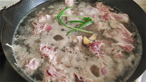 第二步:排骨冷水下锅,下料酒和葱姜开始焯水,随着水温的慢慢升高,排骨中的血污开始慢慢的析出来漂浮在水面之上,呈现灰白色,这时我们要一点一点地将其全部的撇除干净,如果不清除干净,随着焯水时间的延长,这些血污会再次的溶进水中,这样焯水出的排骨就会带有腥味,水开后再烧2分钟,然后捞出用热水或者温水冲洗干净。