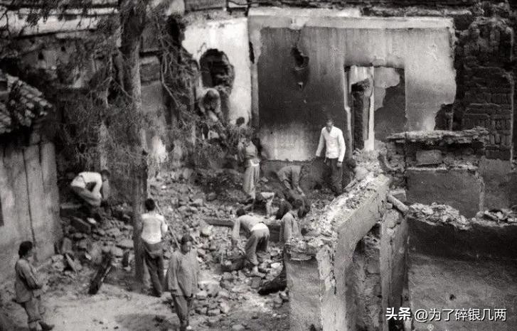 日军扫荡过后的村庄,基本上所有的房子都已经被烧毁或者直接用炸弹炸塌,幸存的村民正在整理房子。