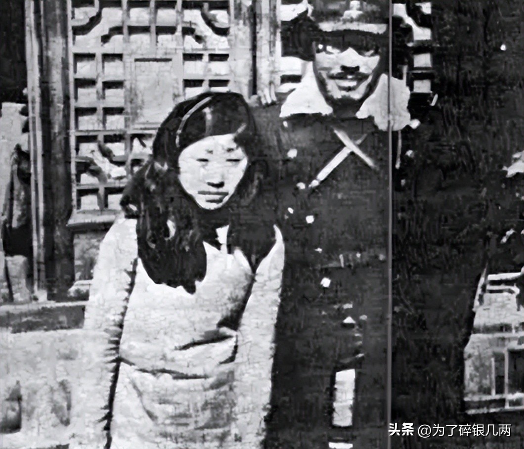 一个女青年被日军抓住,日军军官要求和他一起合影,这个女青年看起来一脸的惊恐,日军军官笑得很猥琐。