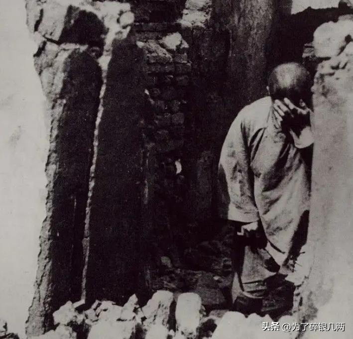 一个幸存的老人,看着自己家的房子,跪在地上,用手捂着脸在哭泣,这些日军简直丧尽天良。
