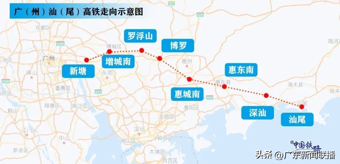 广汕高铁是广东省首次主导建设的时速350公里高速铁路,该线从新建广深铁路新塘站引出至厦深高铁汕尾站,途经广州、惠州、深汕特别合作区、汕尾,设新塘、增城南、罗浮山、博罗、惠城南、惠东南、深汕和汕尾等车站。