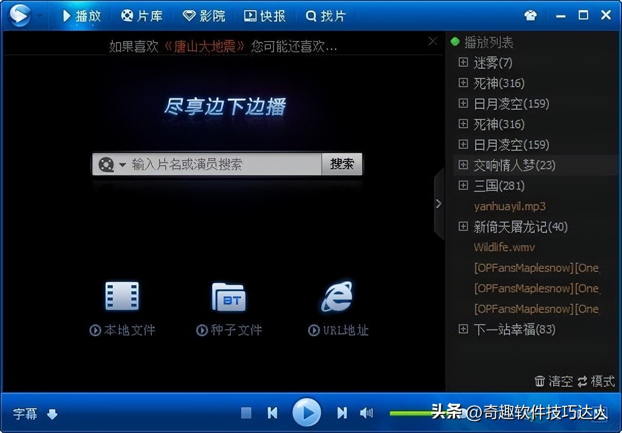 跟其他播放器最大的区别,在于引入P2P技术,支持在线点播、边下边看。