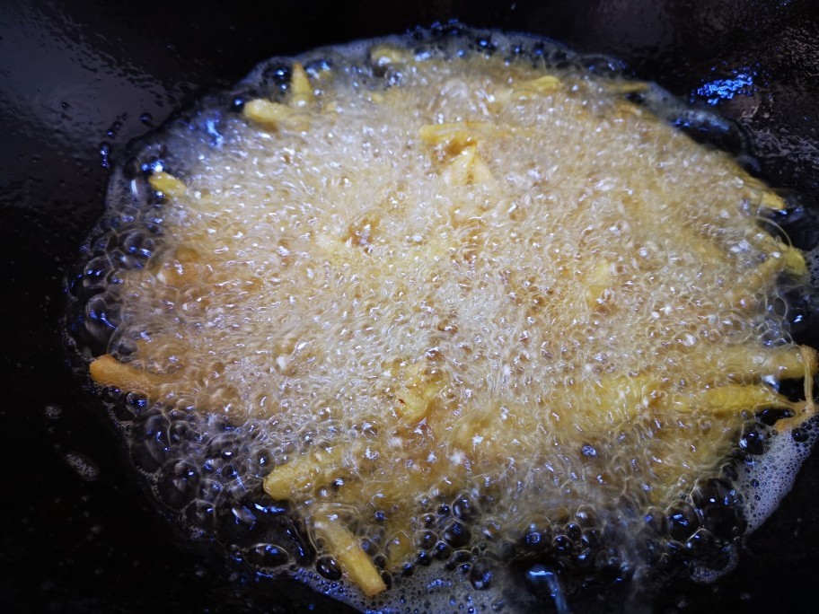 6、下入土豆条,炸至全部上浮,颜色偏黄捞出,把油温升高7-8成热,再次下入薯条,复炸至金黄色,即可捞出,大约为30秒,复炸可以提升酥脆度。