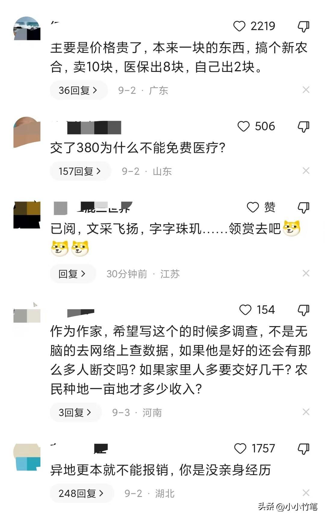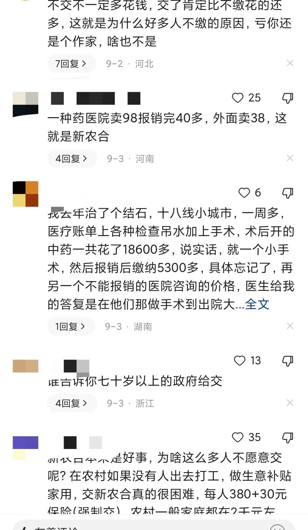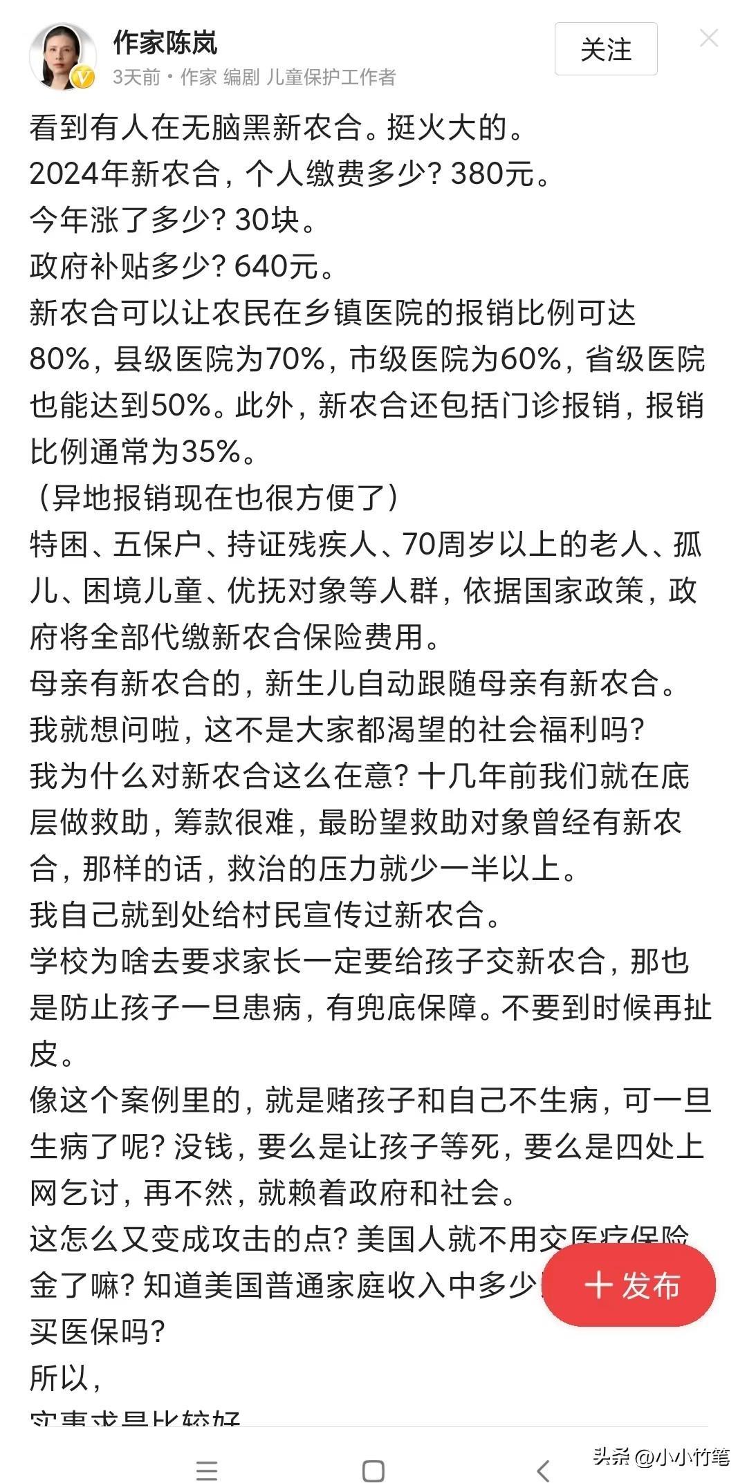针对这个新农合的问题,我不知道陈岚实际接触了多少农村的老百姓,调查走访了多少人,然后写了这篇指责老百姓黑新农合的动态。但从她这篇动态下的留言可以看出,评论区几乎一边倒的对其言论表示了反对和质疑。作为公众人物,还是一个作家。其文章应该是真正的贴合老百姓的生活,反馈老百姓的真实声音,而不是为了流量,哗众取宠。