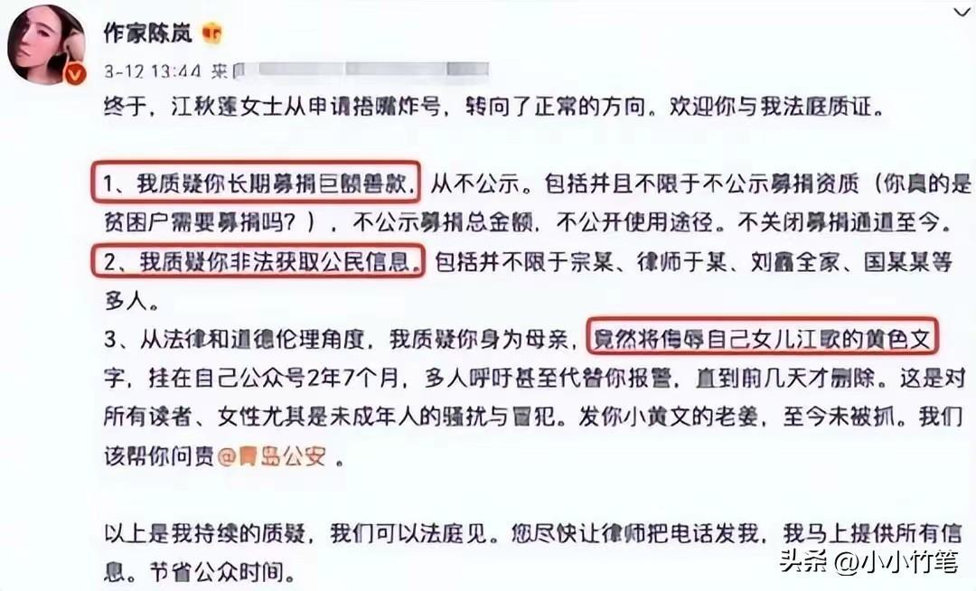 轰动全国的,在东京被杀害的女学生江歌母亲夏秋莲,也曾因女作家陈岚的多篇文章,被送上了舆论的风口浪尖之中。 陈岚多次发文质疑江歌妈妈是为借江歌事件博取同情,借机敛财,在她看来江歌妈妈就是在吃女儿的“人血馒头。”此外,对于网友为江歌妈妈筹集的捐款,陈岚认为江歌妈妈也没有公开,这是“做贼心虚”。