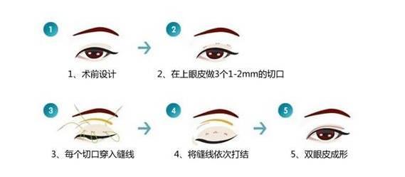 它的伤口是介于缝合式与开放式双眼皮手术之间,就是在眼皮上制作三个长度仅有2—3毫米的不连续的微小伤口,属于半开放式双眼皮手术方法。适用除上眼睑皮肤松弛之外的情况。
