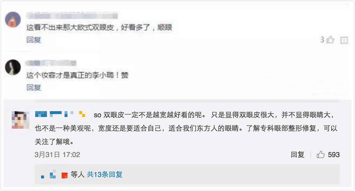 小咕真的一心扎到医美上无法抽身了,看到被各大医美、时尚号拿来做不合适“欧式平行双眼皮”的范例的李小璐,双眼皮变成扇形了,我的心情是......