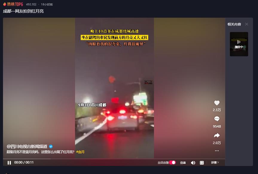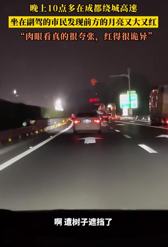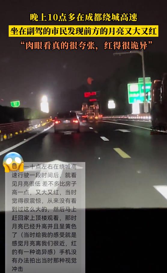 不少人都在说,在成都拍摄到红月亮,并且从描述的情况来看,是在9.3时段,晚上10点多,在成都绕城高速上拍摄的,有网友坐在副驾的市民发现前方的月亮又大又红,并且描述了“肉眼看真的很夸张,红得很诡异”。