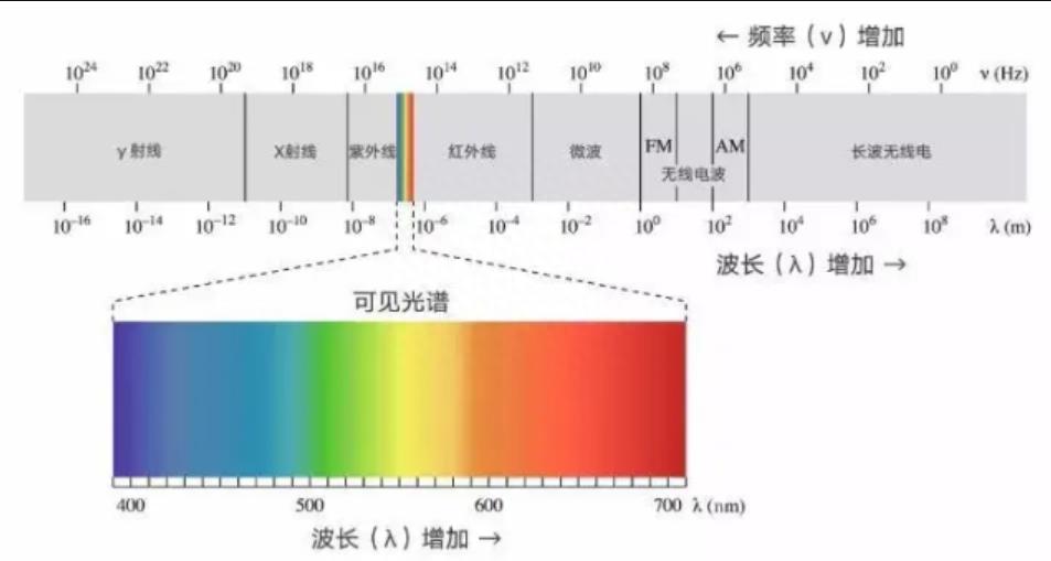 一般来说,就如我们说得太阳光,如果按照波长来划分的话,主要分为紫外线,可见光,以及红外线,其中可见光就是我们人类眼睛可以直接看到的,其波长范围是400nm到700nm。